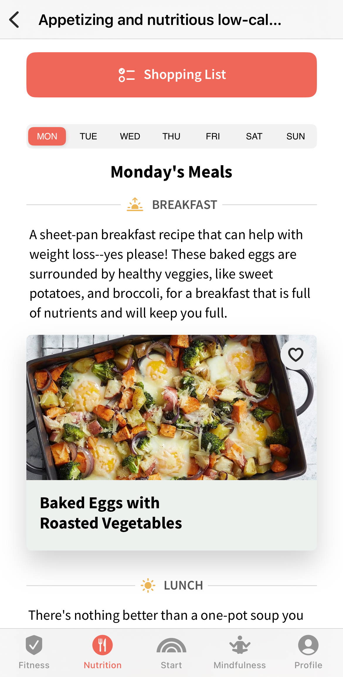 4. Tap on the option you are interested in, and you will be able to see the full menu for that week, including all recipes and shopping lists, as shown below: