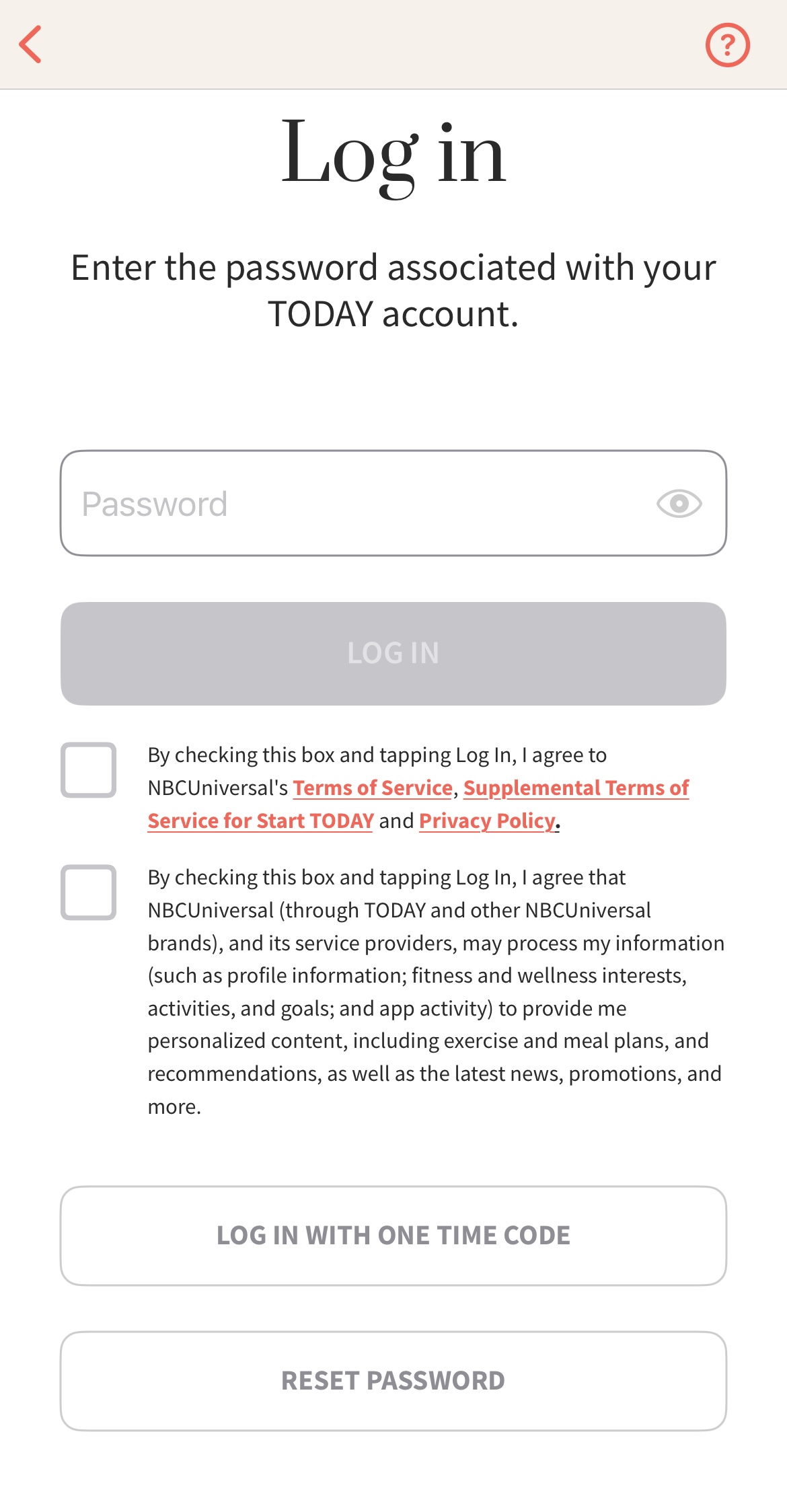 - LOG IN WITH ONE TIME CODE: A code will be sent to the email address associated with your account. The sender will be NBCUniversal Profile. All you have to do is copy the code to log into your Start TODAY app.